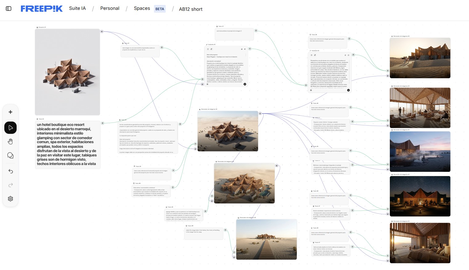 Spaces de Freepik, sistema automatizado de nodos que genera prompts + Imagenes consistentes.